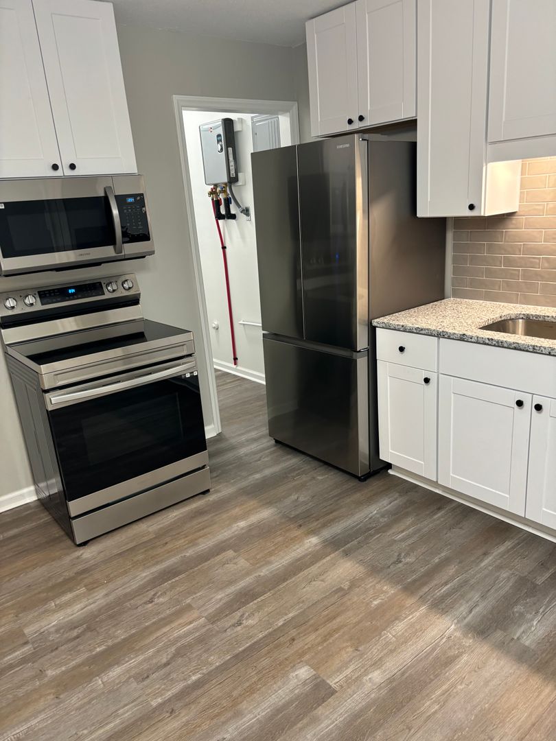 Completely remodeled 2 bedroom 1 bath unit for rent exclusively through Burlington Rentals. All LVP flooring throughout. New stainless steel appliances, ceiling fans, blinds, countertops, etc. Gas heat, tankless water heater, central air, city water/sewer/trash.